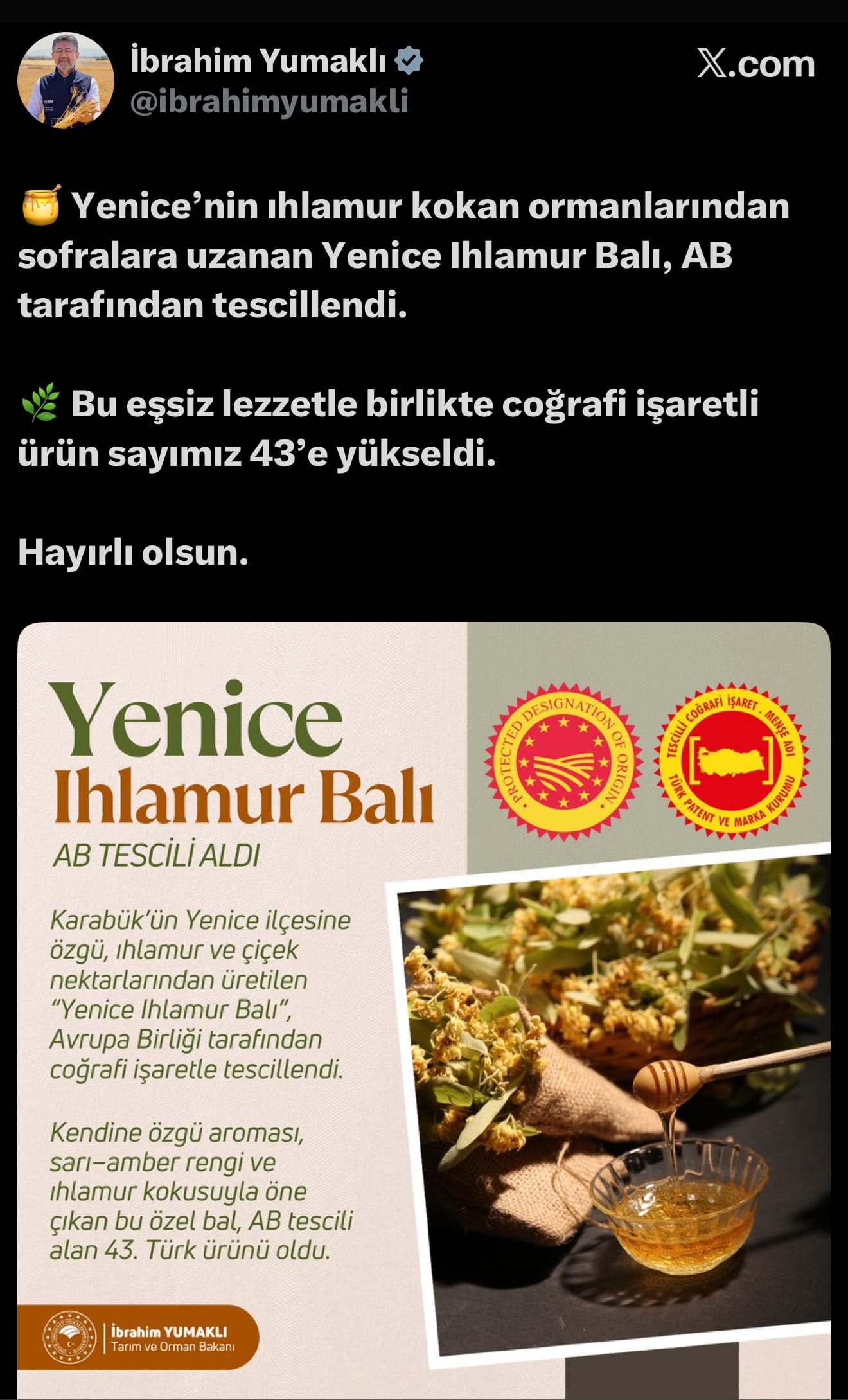 Tarım ve Orman Bakanı İbrahim Yumaklı yaptığı açıklamada,”Yenice’nin ıhlamur kokan ormanlarından sofralara uzanan Yenice ıhlamur balı, AB tarafından tescillendi. Bu eşsiz lezzetle birlikte coğrafi işaretli ürün sayımız 43’e yükseldi. Hayırlı olsun” ifadelerine yer verdi.